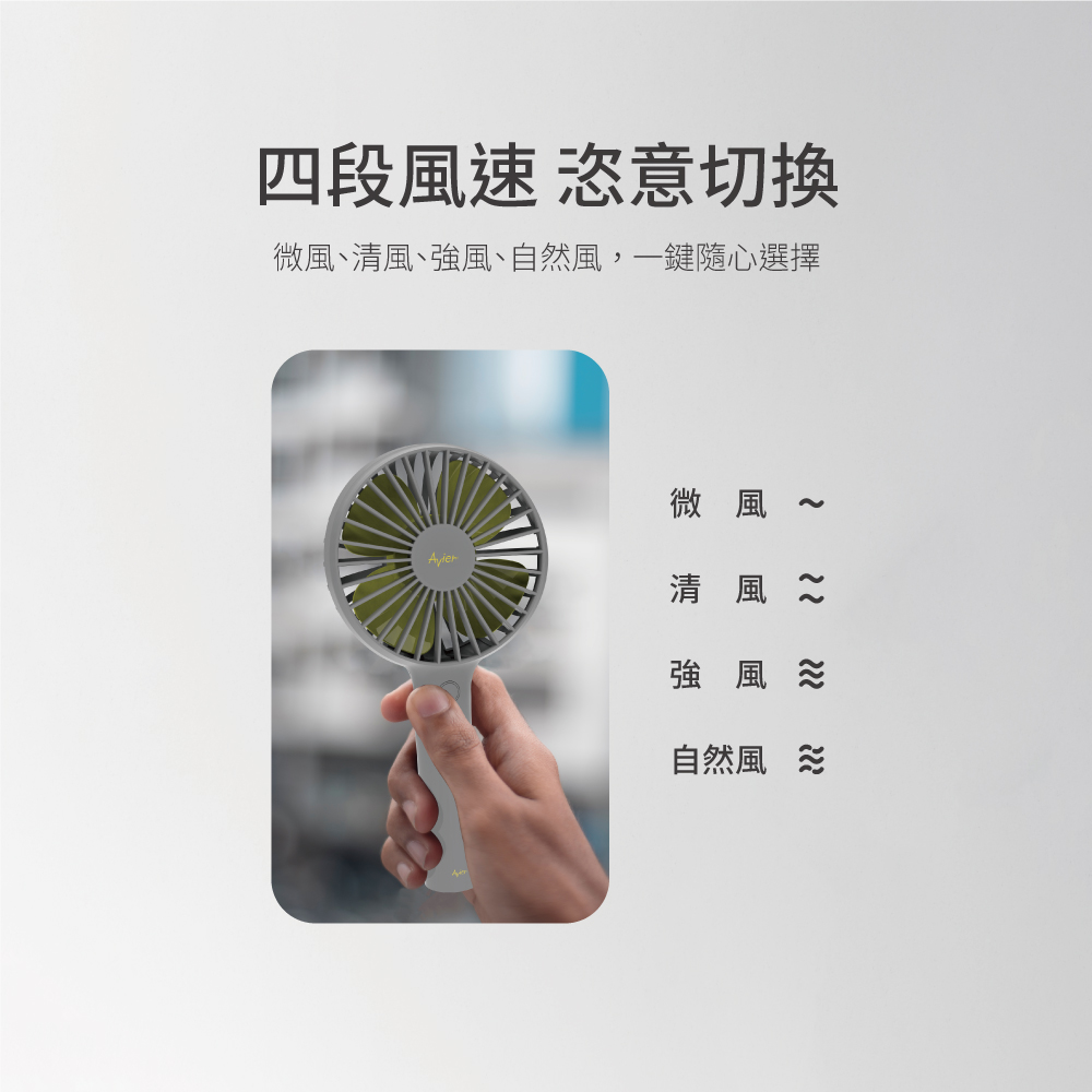 Avier COLOR MIX Hush 手持/桌立兩用風扇具 2600mAh大 電池容量,微風模式可達 10 小時不間斷。能隨著場域及需求一鍵切換,內建四段風速:微風、清風、強風、自然風。四片扇葉的聚焦涼感設計,讓風壓更柔順舒適。